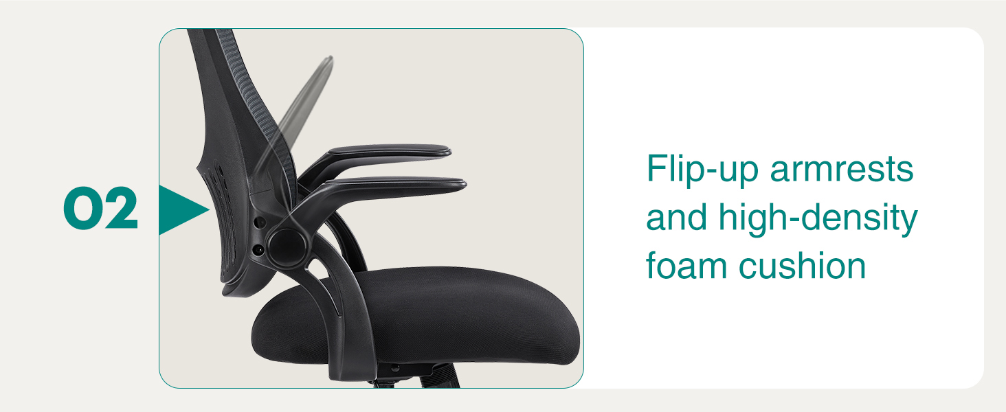 【Space-saving】Flip-up armrests are available and won't be in your way when not in use. The Armrests of the computer chair provide comfortable support for your arms and can be flipped up to save space effectively while not in use. It is perfect for the office, bedroom, study room, living room, or gaming room.
